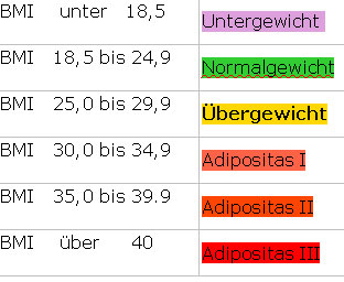 Für das Abnehmen eine erste Kenngröße - der BMI. Die Einteilung von Übergewicht und Adipositas richtet sich nach dem sogenannten Body-Mass-Index (BMI). Dabei wird das Körpergewicht und die Körpergrösse zueinander in Beziehung gesetzt. Dies ist zwar nicht allein ein Maß für mögliche krankheitsrelevante Folgen (z.B. spielt auch der Bauchumfang eine Rolle), aber schon eine gute Orientierung.