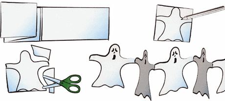 Das Papier der Länge nach in Streifen schneiden, nach der Breite der Streifen richtet sich die Höhe der Gespenster. Nun die Streifen als Ziehharmonika in gleiche Teile falten und das Gespenst auf das oberste Blatt malen. Dabei muss darauf geachtet werden, dass die Arme des Gespenstes bis zum Ende des Papieres reichen. (s. Zeichnung), damit hier das Papier nicht durchtrennt wird und somit eine Kette entsteht. Nun das Gespenst ausschneiden und die Kette auseinander falten. Diesen Vorgang mehrmals wiederholen und die Ketten zusammenkleben, sodass eine Girlande entsteht. Besonders schön sieht es aus, wenn man verschieden farbiges Papier verwendet und die Ketten mit abwechselnden Farben zusammen klebt.