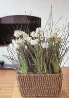 Die ästhetische Schönheit der Paperwhite-Narzissen (Narcissus papyraceus) passt zu jedem Wohnstil. Auch ihre Blüten haben einen feinen Duft. Die zarten Stiele müssen jedoch gestützt werden, wenn sie sich zum Licht strecken. Viel zarter und natürlicher als gekaufte Stützen sehen kahle Zweige aus, die zwischen die Blüten gesteckt werden. Einfache Körbe, ausgelegt mit robuster Plastikfolie, eignen sich als Pflanzgefäße für ein traditionelles Ambiente.