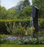 Aufeinander abgestimmt und sich ergänzend wirken Naturstein und Wasser. Umrahmt erscheint dieses idyllische Bild durch einzelne Stauden, Gräser und durch flache Kieselsteine. Dabei sind die Pflanzen und die Besteinung ideal aufeinander abgestimmt.
